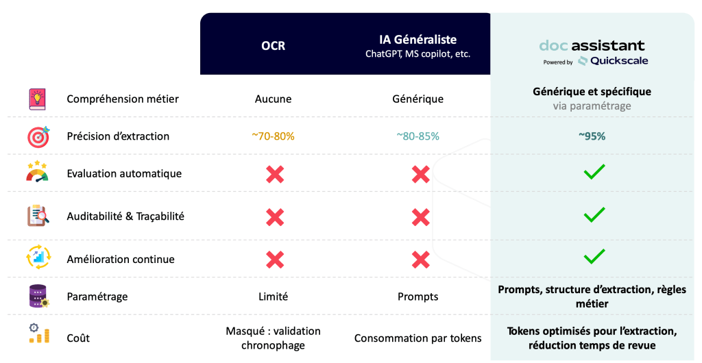 Les solutions traditionnelles, telles que l’OCR simple ou les GED rigides, n’offrent ni la contextualisation métier nécessaire ni l’auditabilité indispensable dans des environnements régulés. Les outils généralistes d’IA produisent souvent des résultats imprécis ou inexacts, entraînant une méfiance généralisée chez les utilisateurs métiers.